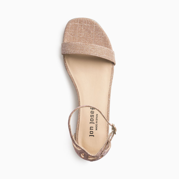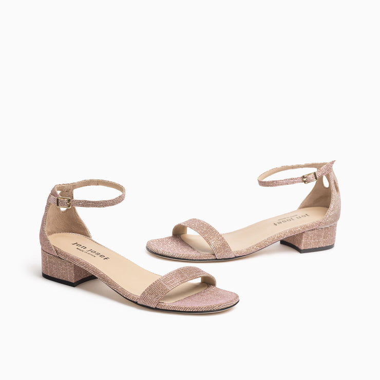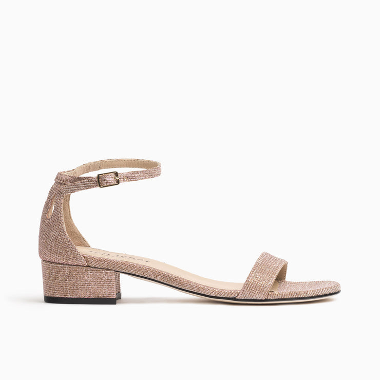 A little glam is in this nude-colored low heeled glitter dress sandal that's equally elegant as it is practical. A generous front ensures your toes remain off the pavement while an extra padded insole provides for all-day...or night comfort.