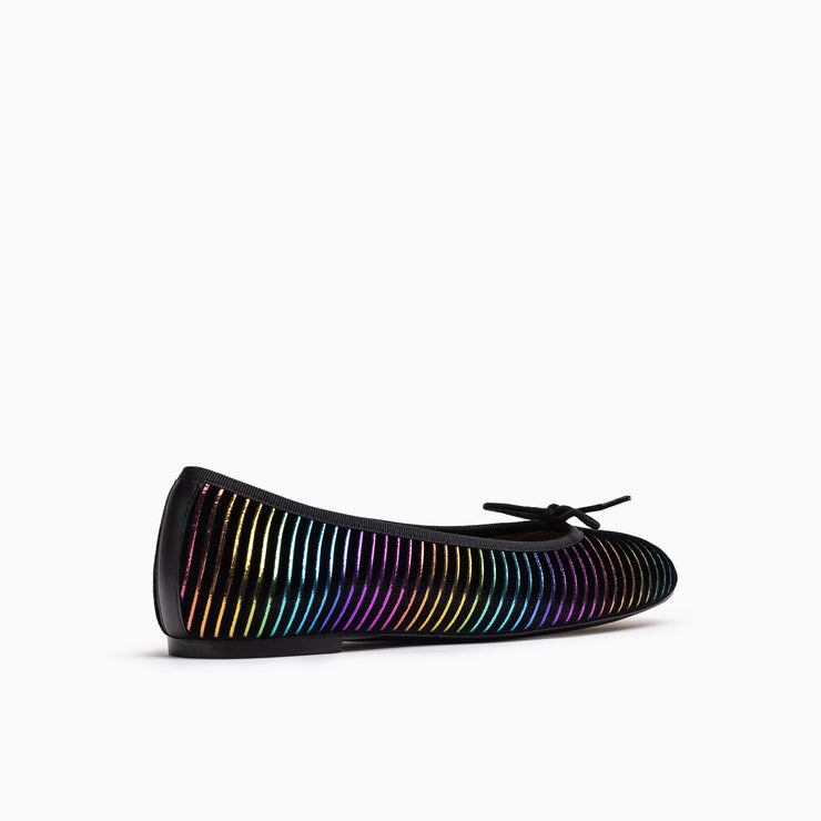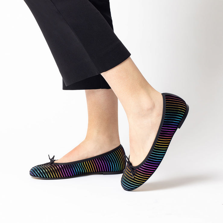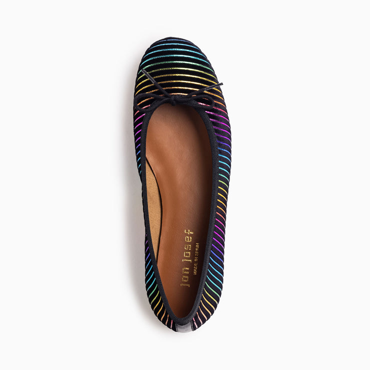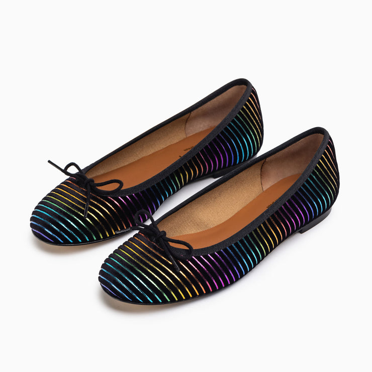 The classic, comfortable black velvet ballerina silhouette has a the extra flair of a metallic multi-colored upper. With workable bow detailing, this newest addition to our line will be a forever classic kick to your wardrobe.